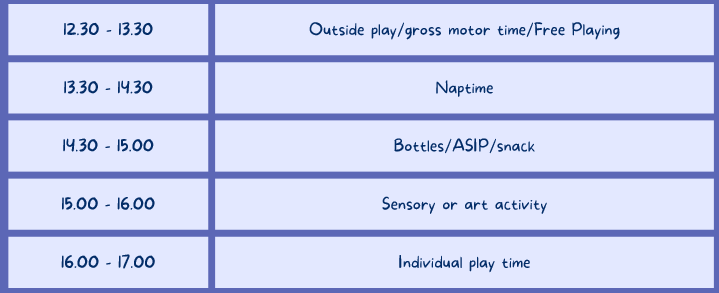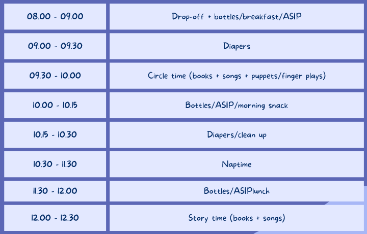 Jadwal penitipan bayi ini dirancang untuk memenuhi kebutuhan anak-anak antara usia tiga bulan hingga 2 tahun (atau ketika mereka mulai berbicara dan berjalan). Membangun peluang untuk terlibat dengan bayi satu lawan satu akan membantu mendorong kemajuan mereka di semua tonggak perkembangan.