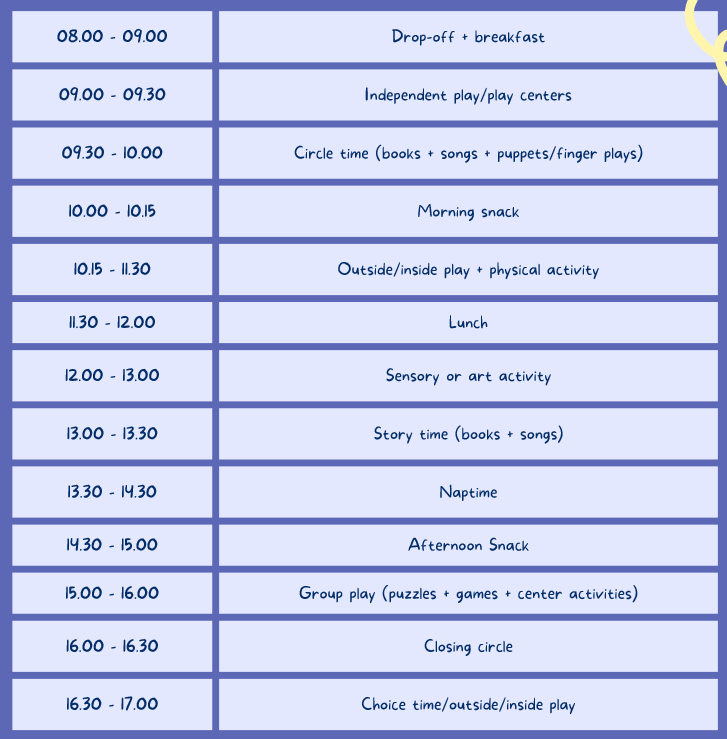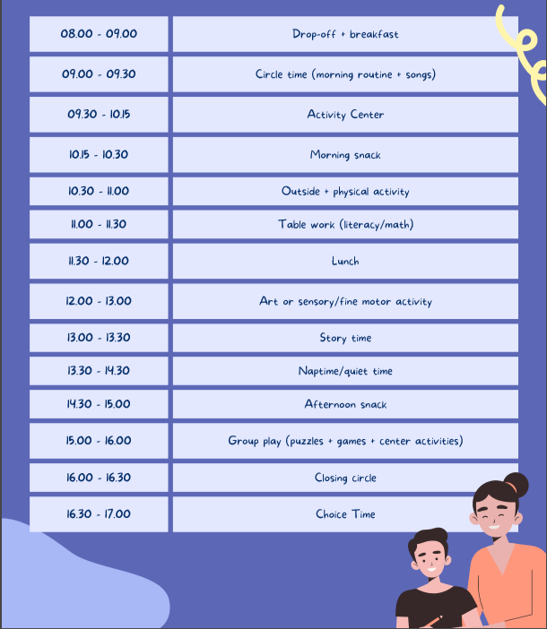 Jadwal penitipan anak balita/Toddler ini dirancang untuk memenuhi kebutuhan anak-anak dari usia 2 tahun hingga tiga tahun. Anak usia ini umum nya sudah dapat bergerak dan bekerja keras untuk berkomunikasi secara verbal. Sehingga dibutuhkan banyak waktu untuk melatih bahasa dan keterampilan motorik kasar yang akan menjadi dasar dari jadwal harian untuk balita/toddler.