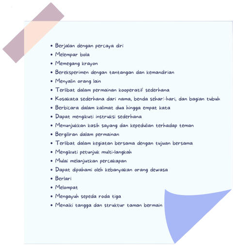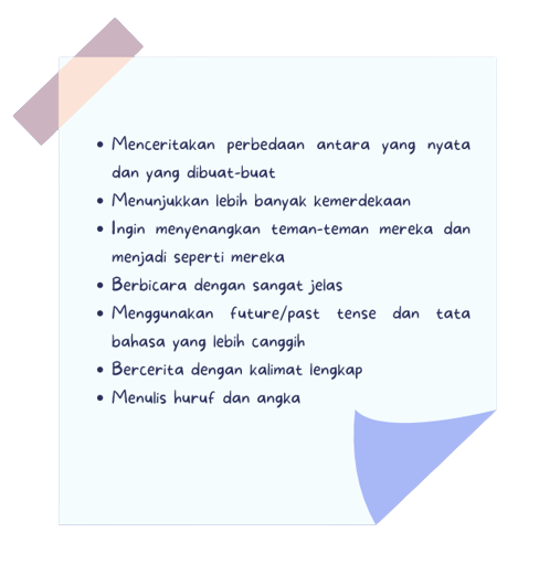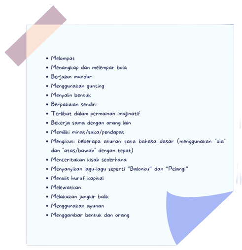 Anak dengan kelompok usia ini akan lebih fokus pada motorik halus dan kemampuan bahasa/kognisi dan keterampilan kesiapan sekolah dan lain-lain. Membangun kegiatan yang lebih terstruktur dengan fokus akademik yang meningkat akan mendorong kemajuan pada tonggak perkembangan kelompok ini.